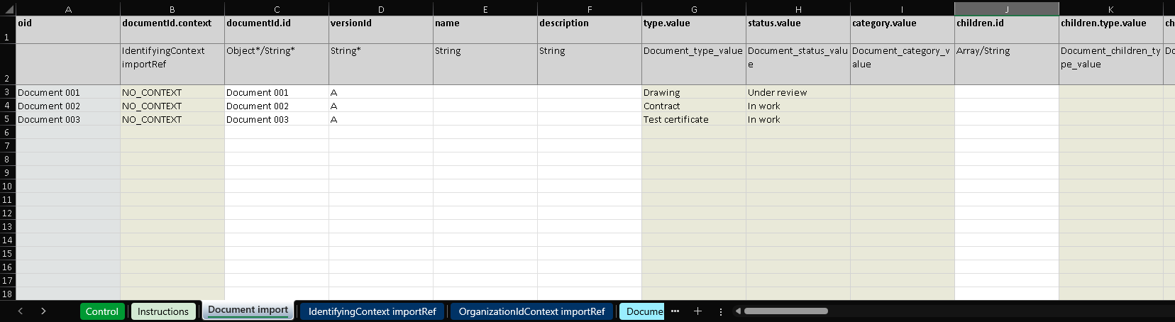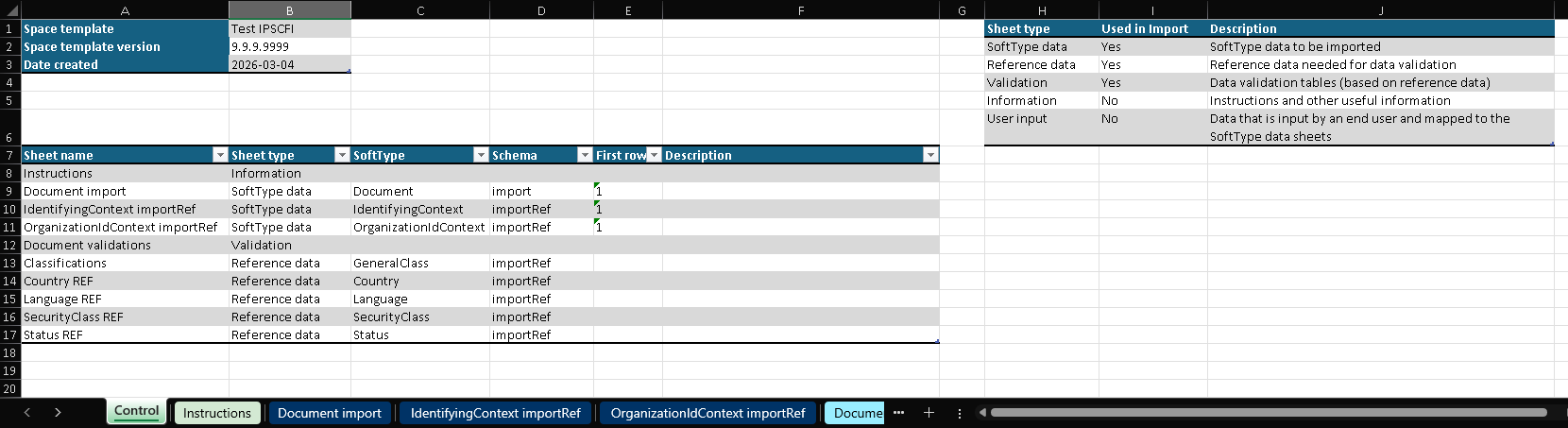 The excel template contains softType data sheets. It may also contain a control sheet, reference data sheets and validation sheets.