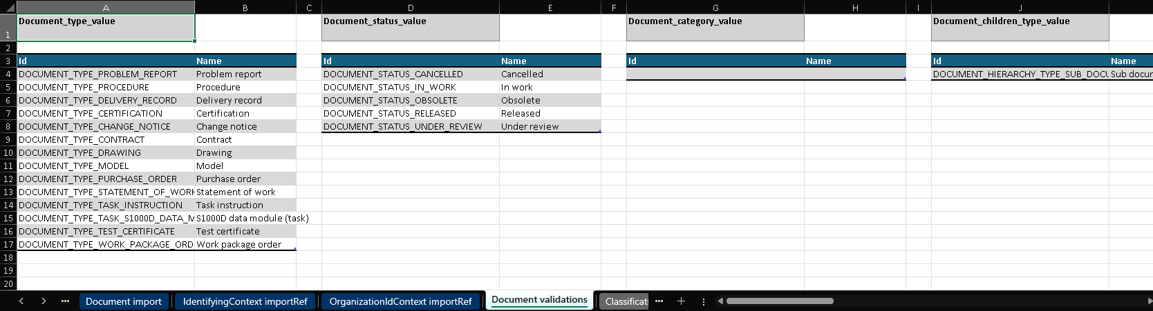 This table is generated by the by the excel template generator, new rows can be added manually.